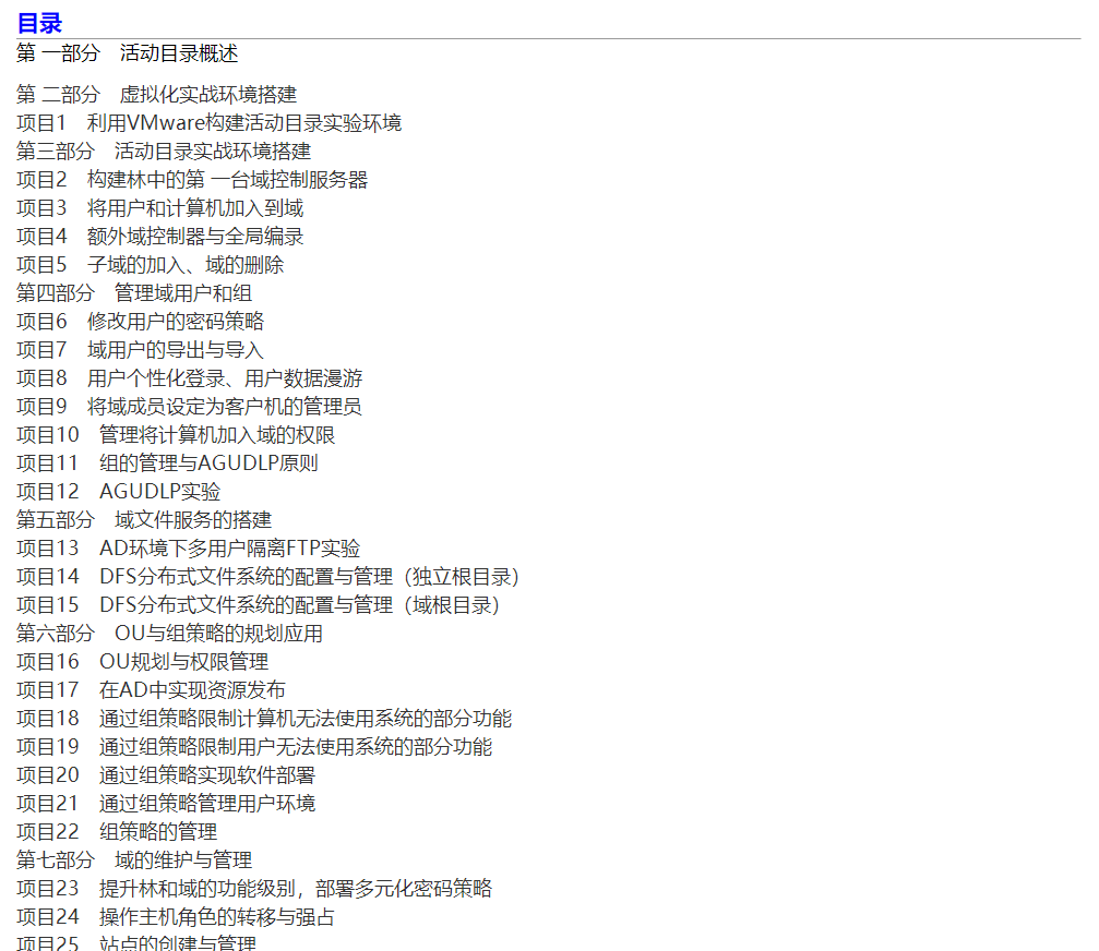 资源围绕网络管理员、网络工程师等岗位对AD活动目录核心技术技能的要求,基于工作过程系统化方法,由简入深,需包含构建林中的第一台域控制服务器、与用户的导出与导入、通过组策略限制计算机无法使用系统的部分功能、部署多元密码策略等26个项目,场景化的还原企业实际项目和业务流程。每个项目都按企业工作实际分解为若干个工作任务,系统讲述了构建林中的第一台域控制服务器、与用户的导出与导入等工作任务实施所需的相关理论与实践,通过项目背景、项目分析、项目相关知识为子任务做铺垫,任务实施过程中由任务说明、任务分析、任务操作和任务验证构成,符合工程项目实施的一般规律。