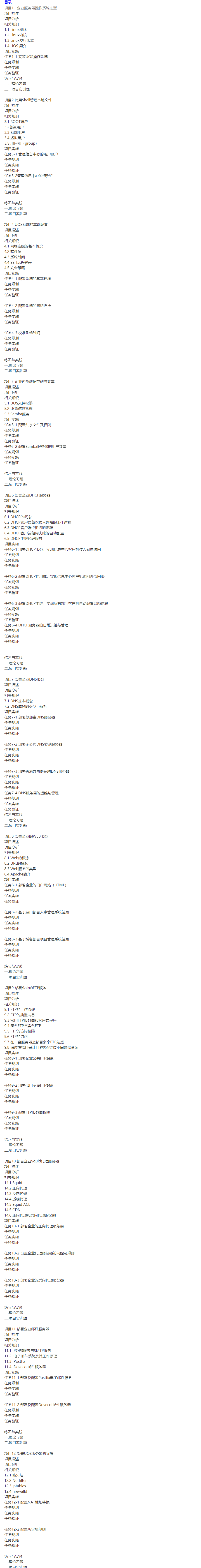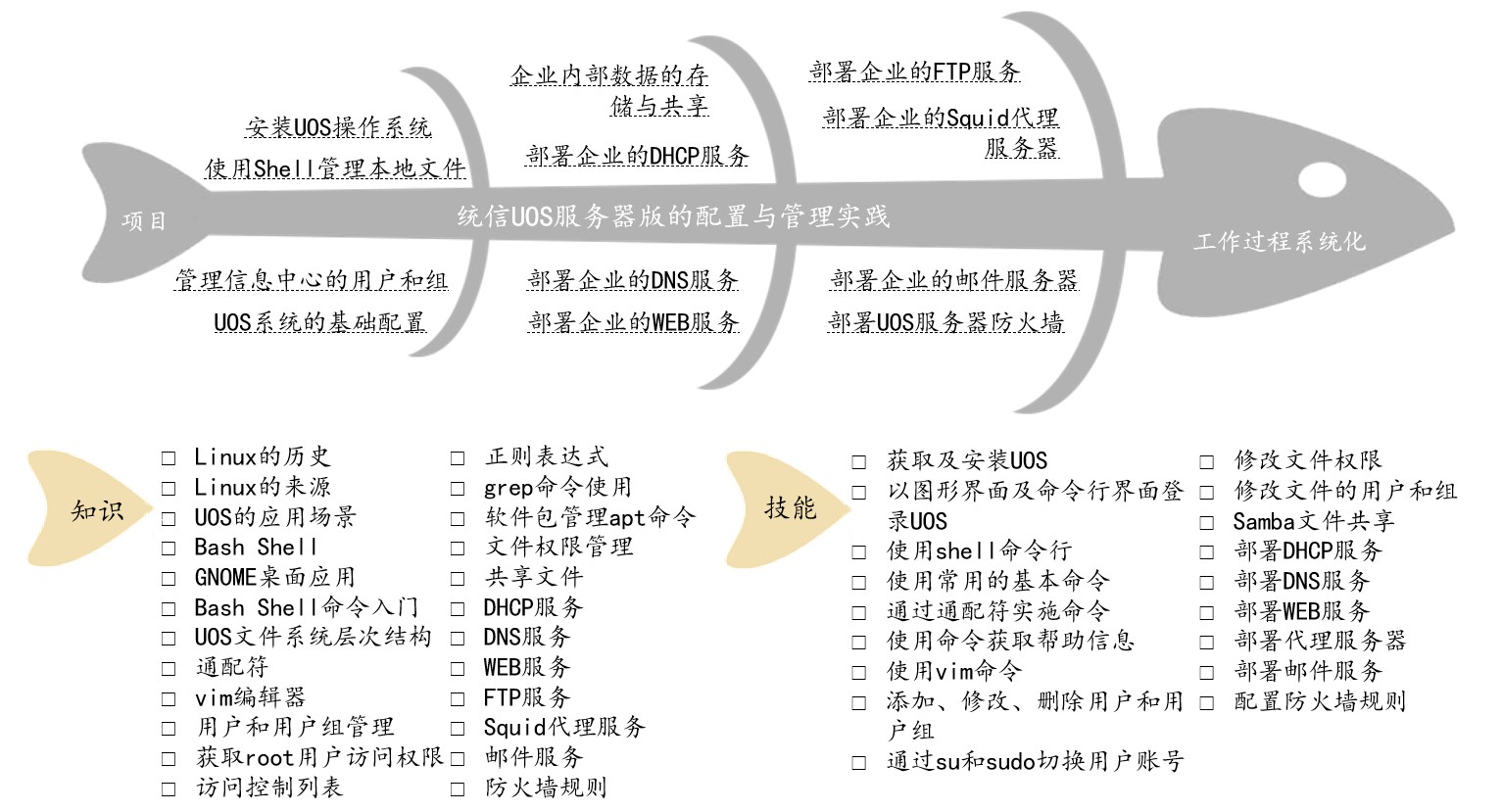 统信UOS服务器版课程资源涉及知识点和技能点包括但不限于UOS简介、shell、Bash、目录结构、文件系统、VIM编辑器、用户与组、SSHD远程登录、网络简介、安全策略、软件源、UOS文件权限、UOS磁盘管理、SAMBA服务、DHCP服务、DNS服务、WEB服务、FTP服务、代理服务器、邮件服务器、防火墙、NAT转换等。每个项目都按企业工作实际分解为若干个工作任务,通过项目背景、项目分析、项目相关知识为子任务做铺垫,任务实施过程中由任务说明、任务分析、任务操作和任务验证构成,符合工程项目实施的一般规律。
