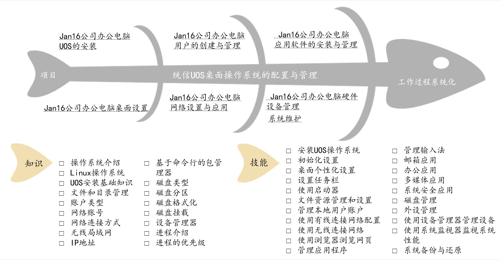 资源围绕桌面管理员岗位对UOS桌面版的安装、应用与维护核心技术技能的要求,基于工作过程系统化方法,按照操作系统的安装、应用和维护过程,基于简单到复杂这一规律,设计了7个进阶式项目案例。将UOS操作系统应用知识碎片化,按项目化方式重构,在每个项目中按需融入相关知识,用业务流程驱动学习过程。每个项目都按企业工作实际分解为若干个工作任务,通过项目背景、项目分析、项目相关知识为子任务做铺垫,任务实施过程中由任务说明、任务分析、任务操作和任务验证构成,符合工程项目实施的一般规律。