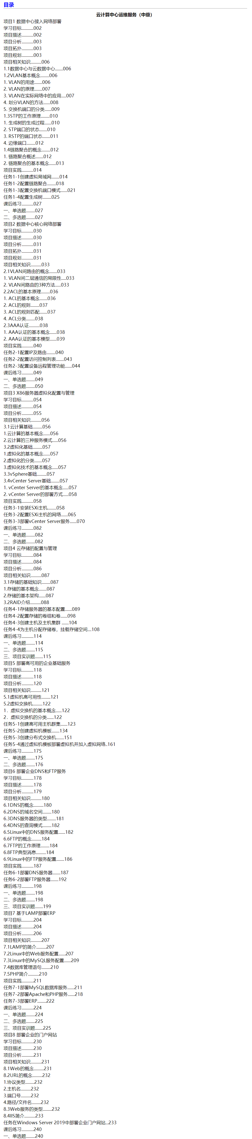 本书主要以云数据中心运维项目为背景,采用项目化的编写体例,主要内容包括: 云数据中心网络架构规划与部署,对路由器与交换机进行相关配置, 完成云数据中心基础网络环境的搭建; X86服务器与存储运维,将计算节点虚拟化,安装存储节点并初始化配置,完成云数据中心基础硬件环境的配置;部署高可用的基础服务与应用服务,在计算节点及存储节点上部署高可用的企业基础服务和应用服务以满足业务需要;云数据中心自动化运维与监控,在计算节点及存储节点上完成自动化运维与监控的配置。
