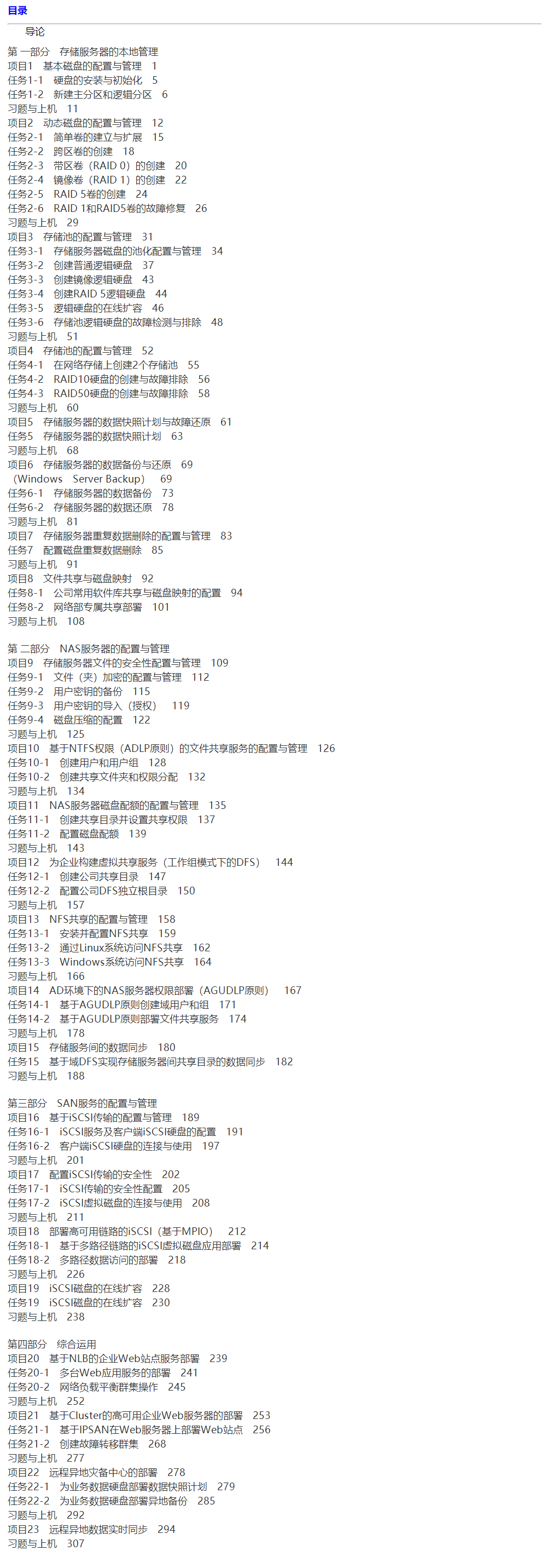 2012平台构建企业网络存储架构的相关技术,共分23个项目,内容包括基本磁盘的配置与管理、动态磁盘的配置与管理、存储池的配置与管理、存储服务器的配置与管理、文件共享、NAS服务的配置与管理等相关技术。