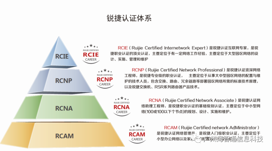 锐捷认证是IT领域的网络专业技能认证,拥有锐捷认证资格的人士将具有专业的网络知识和网络技能,并具有在特定的技术、领域或者职业岗位的专业能力,并且能为他们的雇主带来巨大的价值和回报。锐捷认证体系包括职业认证、专项认证、行业认证、师资认证。